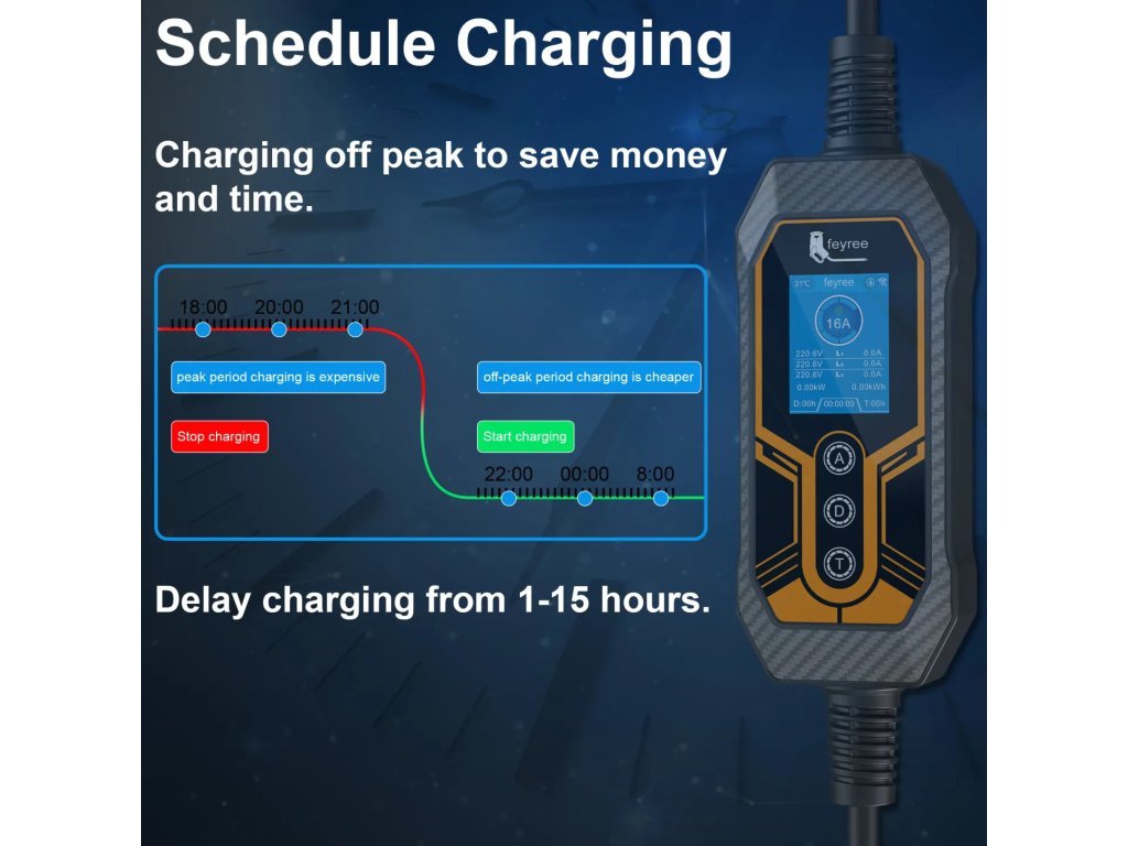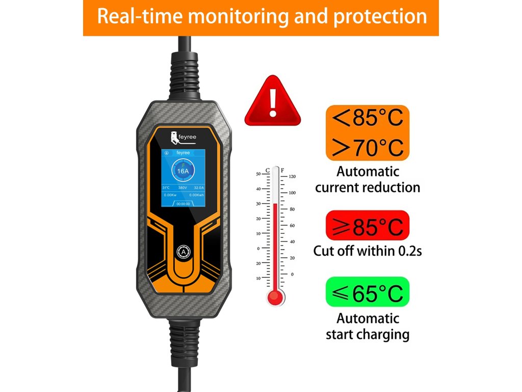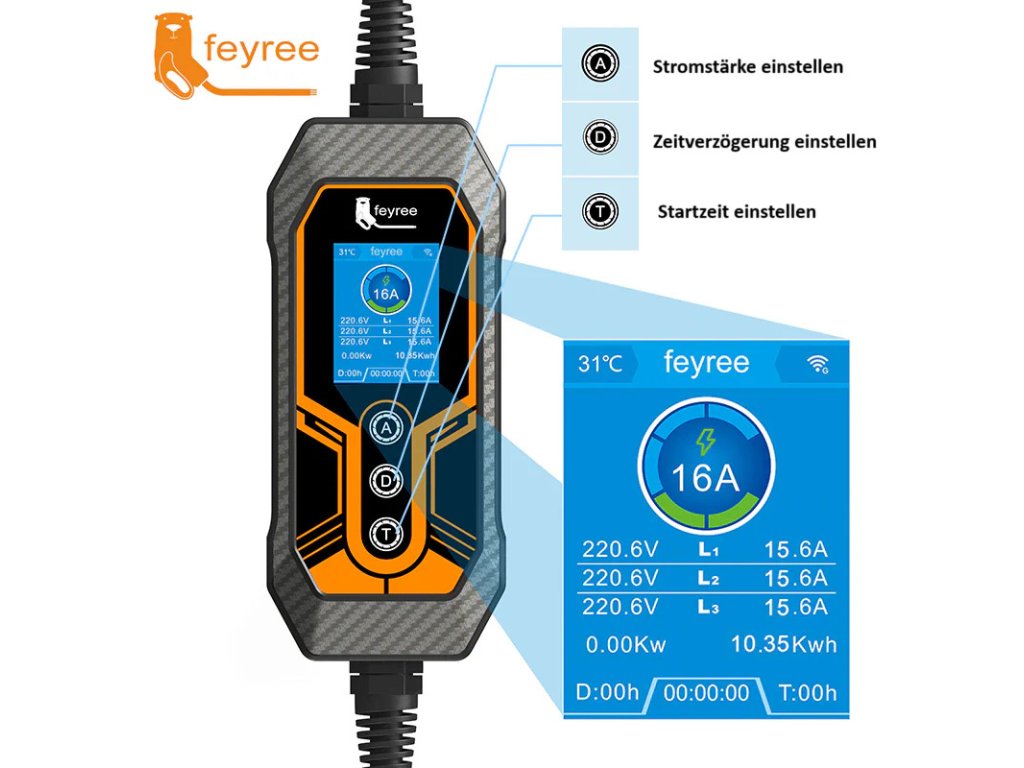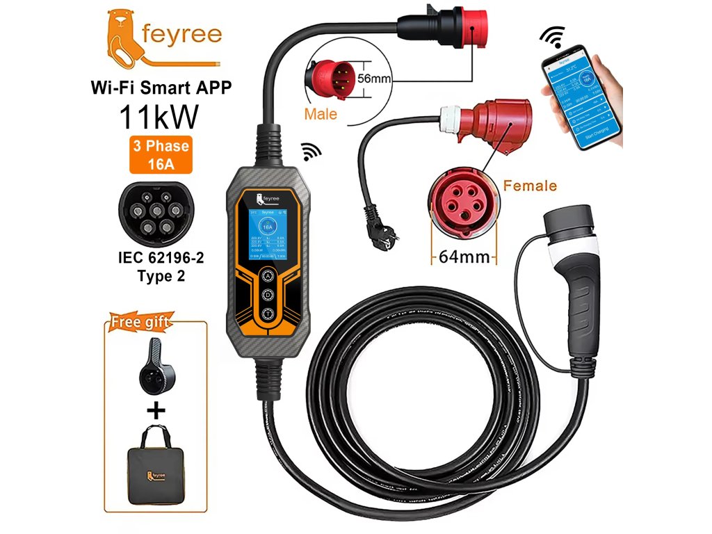 Feyree 11 kW Přenosná chytrá nabíječka pro elektromobily Typ 2 | Wi-Fi & Bluetooth & Aplikace